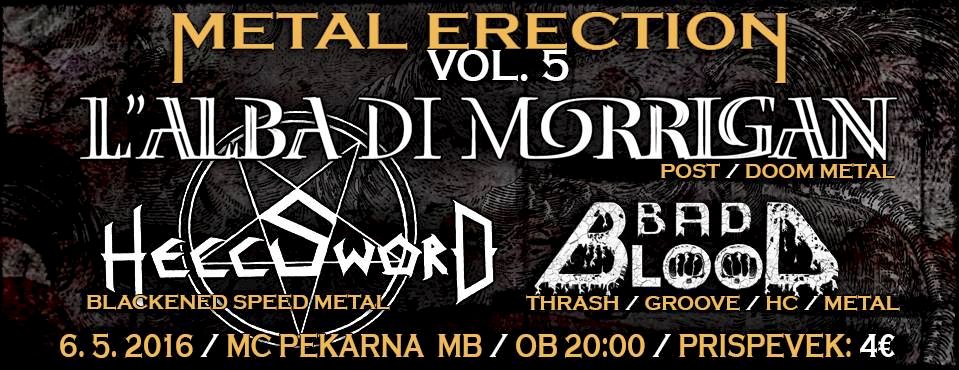 Spomladanski dnevi so tu, in da ne bo vse tako sončno ter odeto v rožice, smo za vas pripravili temačno obarvan, vendar vseeno vroč večer v MC Pekarni. 6. maja se bo odvijala Metalna Erekcija V. in tokrat se nam bodo pridružili trije bendi in sicer Italijani L'ALBA DI MORRIGAN, Hrvati BAD BLOOD in Slovenci HELLSWORD.